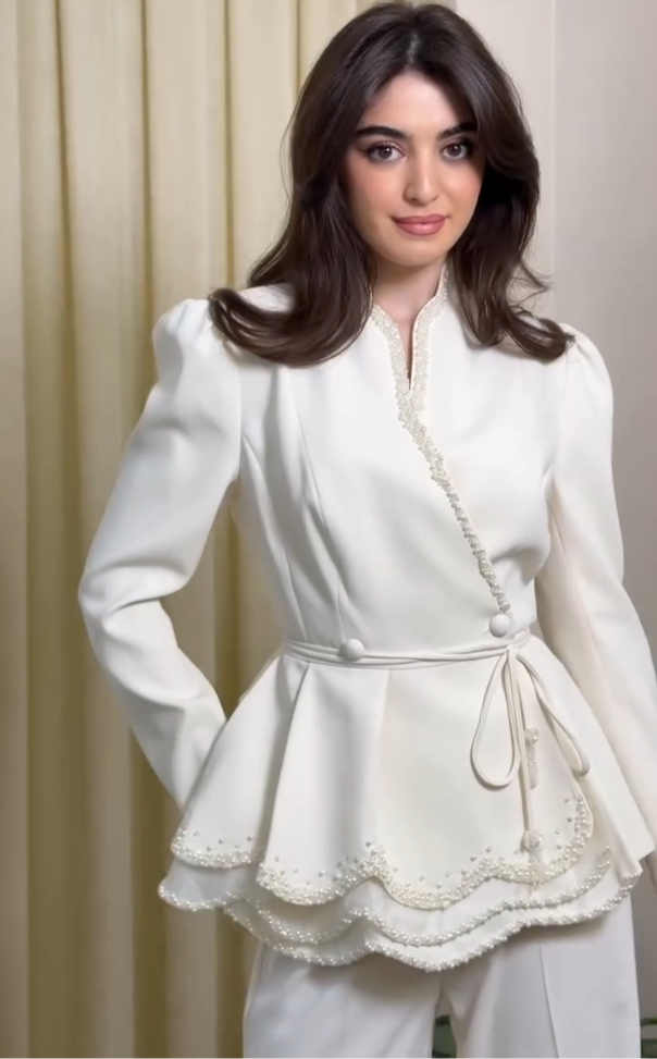 Um verdadeiro símbolo de sofisticação e delicadeza. Este blazer off-white é confeccionado em tecido estruturado de alta qualidade, com corte impecável que valoriza a silhueta. O detalhe especial fica por conta do acabamento bordado com pérolas na barra e gola, trazendo elegância única. O cinto ajustável marca a cintura e garante um caimento perfeito, ideal para eventos formais, jantares sofisticados ou ocasiões especiais.