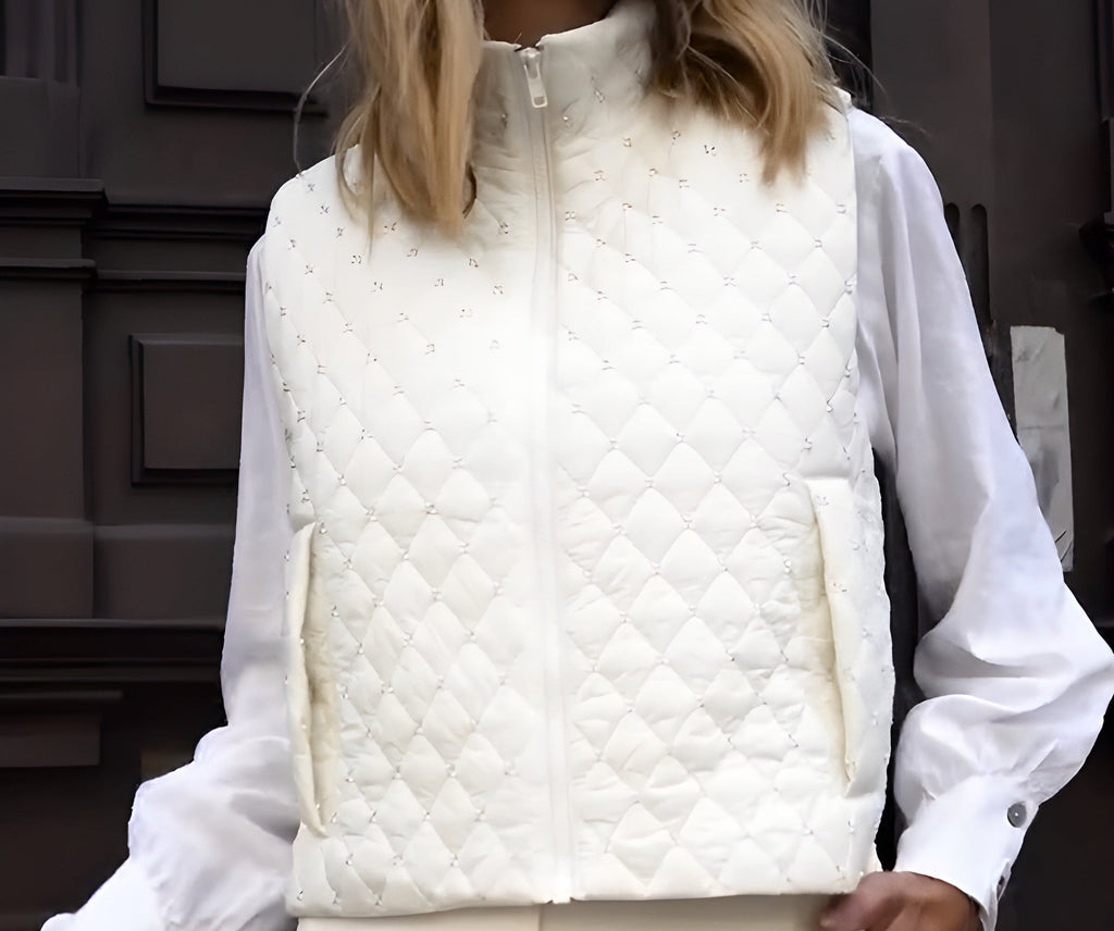 Estilo, conforto e elegância em uma única peça. Este colete matelassê off-white é perfeito para compor looks sofisticados em dias frescos, garantindo praticidade e charme. Confeccionado em tecido estruturado com acabamento acolchoado em losangos, traz bolsos funcionais e fechamento em zíper para maior comodidade. Os pequenos bordados delicados no tecido adicionam um toque de exclusividade, tornando-o ideal para produções casuais chiques ou sobreposições modernas.